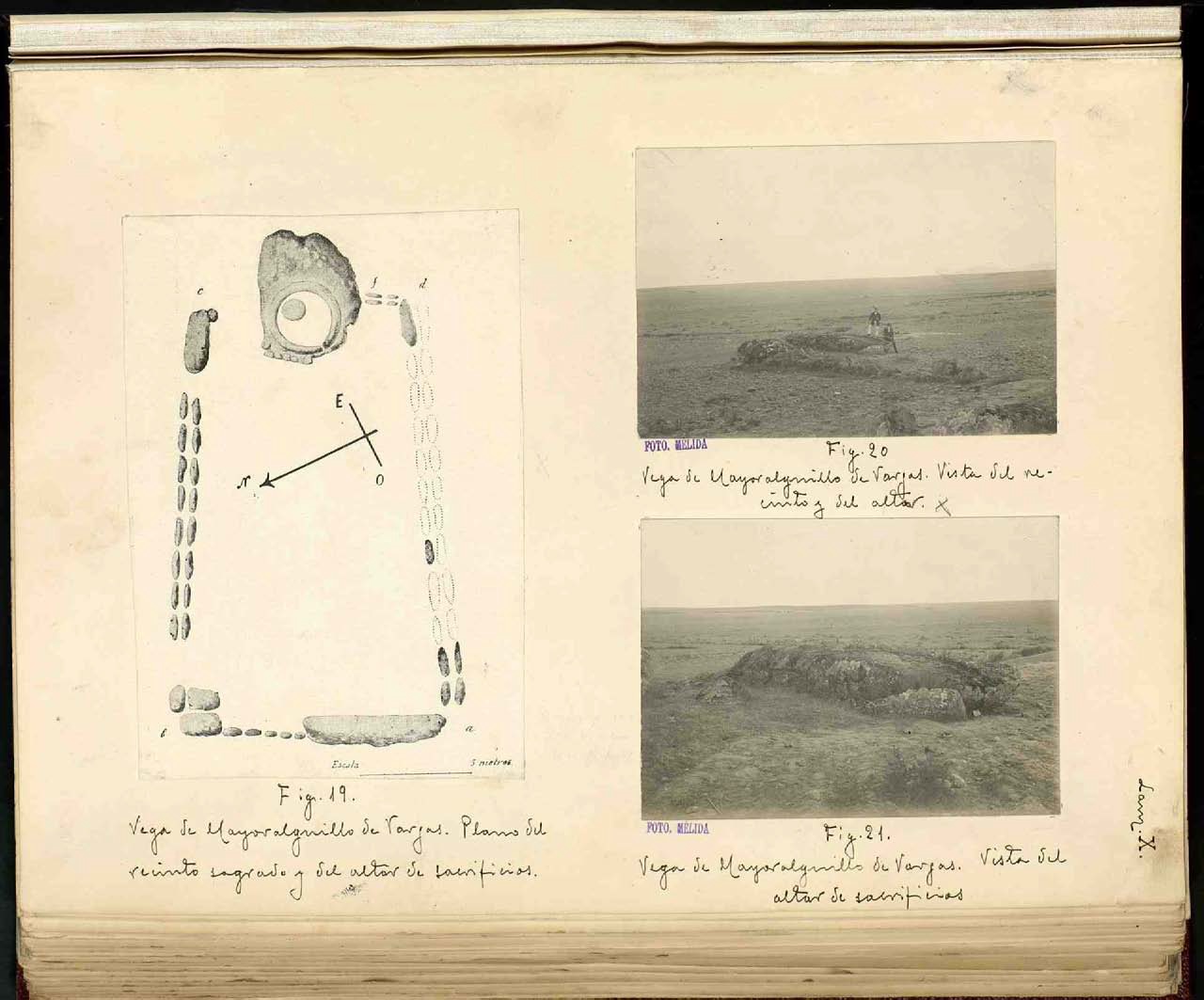 Pero en esta ocasión no nos referiremos a estas construcciones señoriales sino que nos remontaremos un poco más en la historia. Hace algún tiempo que conozco la dehesa de Mayoralguillo, prácticamente he pasado mi infancia en ella, pero jamás supe de ello hasta que me llamó la atención una entrada que leí en el blog de mi amigo Rubén Núñez, Cáceres al Detalle, donde hablaba de la posible presencia de un altar de sacrificios en la dehesa. Por lo tanto me puse a investigar como “buen arqueólogo” y encontré referencias a ello en el Catálogo Monumental de J.R. Mélida quien visitó este lugar junto a Juan Sanguino Michel hacia 1915. Mélida en su catálogo proporciona en primer lugar unos datos sobre su localización, según dice “a 13 kilómetros a SO de Cáceres en la dehesa de Mayoralguillo de Vargas y a 200 metros de la casa”; y lo describe de la siguiente manera: “el recinto está formado simplemente por cantos colocados generalmente en hileras de manera longitudinal formando un trapecio algo irregular. Mide 18,50 metros de longitud en su lado NO, y su opuesto, 21,20 metros; en la base del trapecio 11,80 metros, y en el extremo opuesto, que es donde se localiza el altar no hay cerramiento sino libre por ambos lados, y en total tiene el recinto por allí una anchura de 8,50 metros”.